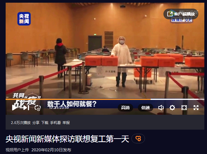 【2】2月10日,全国复工复产的第一天,央视新闻新媒体记者专门走进联想,了解整个园区的防疫工作,并专门前往联想健力源餐厅,拍摄餐厅的疫情防控措施,对餐厅的盒饭供应、地面“一米线”提示、单向就餐座椅摆放等防疫举措进行了报道。餐厅配餐